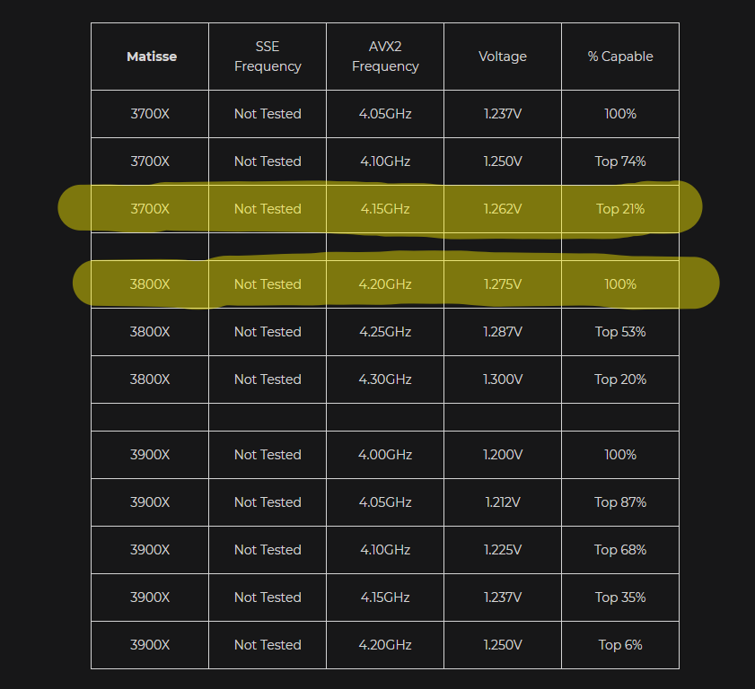 Mi riferisco alla spasmodica ricerca di ram performanti (ci ballano anche 100 euro e oltre), MB ultimo grido tutte colorate (qui rasentiamo il ridicolo con il loro costo), bios griffati. Ti prendi qualcosa di decente, certificato e che funzioni out of the box e credimi spendi meno. Senza contare il costo uomo, perchè di tempo ce ne perdi a sistemare l'OC. Se sei uno studentello perditempo va bene, ma se con il pc ci lavori, il discorso è diverso. Ad esempio ![]() (credits https://siliconlottery.com/pages/statistics)