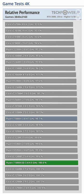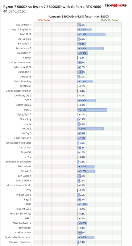 ![]() Wow.. che salto.. veramente.. per il 6.8% in più ![]() Che il parole povere si traduce: Se fai gia 100fps si traduce in 6,8fps in più... che vero upgrade che è! da comprare e preferire subito al mio 5950x ![]() Stessa cosa se uno viaggia con una rtx 3080, test fatti sempre dal noto sito: ![]() il 5800x3d va lo 0.9% in piu del 5950x e lo 1.3% in più rispetto al 5800x.. ora... ma quelli che fanno gli upgradde, guardano queste cose oppure date solo aria fritta per dover comperare una cpu che a certe ris. non serve praticamente a NULLA? Questa non voglio nemmeno commentarla perchè parla fin troppo chiaro... ma giusto per intenderci.. il 5800x3d sta sotto anche al suo fratello 5800x per non parlare del 5950\5900x -.- ![]() A conti fatti chi consiglia un upgrade a chi ha gia una serie 5xxx AMD che non sia il 5800x3d, non serve praticamente a nulla se giocate dal 2k in su. Differenza appena piu' marcata di qualche punto percentuale se uno ha on board una rtx4090, ma sfido colui che usa questa scheda video da quasi 2.000€ a risoluzione 1920x1080.. quindi ricapitolando il succo, 5800x3d cestinato a mio parere.