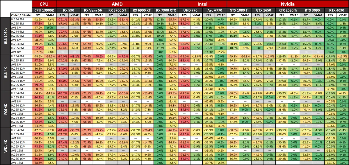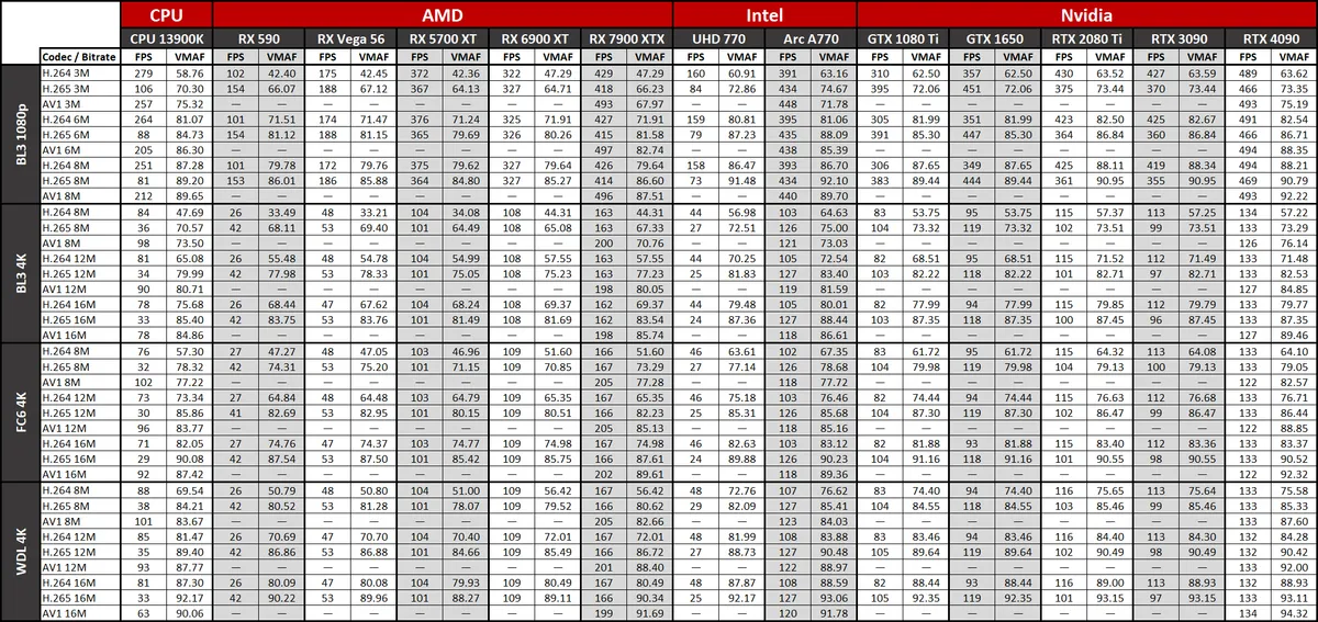 https://cdn.mos.cms.futurecdn.net/Cw...00-80.png.webp https://cdn.mos.cms.futurecdn.net/nK...00-80.png.webp In breve, tradotto: "Abbiamo anche una seconda tabella, questa volta colorata in base alle prestazioni e alla qualità relative al miglior risultato per ogni codec e bitrate. Un aspetto interessante che è facilmente visibile è la velocità dell'hardware di codifica AMD a 4K con la RX 7900 XTX, e allo stesso modo puoi vedere quanto sia veloce l'encoder della serie RTX 40 a 1080p. La qualità nel frattempo favorisce la serie 40 e le GPU Arc". Prendendo spunto da questa tabelle sulle velocità di conversione qui sopra io personalmente ho convertito con GPU Vega 56, RTX2080TI, 3090 e 4090 e con CPU 5950X, 5800X3D e 1800X una miriade di filmati utilizzando vari codec e risoluzioni di partenza. Dai propri risultati di conversione Tom's ha scritto questo articolo: https://www.tomshardware.com/news/am...quality-tested Io nel mio piccolo posso dire che, con cronometro alla mano ed occhiale calzato alla ricerca del minimo artefatto visivo, il budget a disposizione lo indirizzerei per la maggior parte nella GPU (non AMD). Il resto sono soldi buttati. PS: come dice WarSide pure quel "rottame" della Arc A380 potrebbe andare decisamente meglio del 7950X...anzi togliamo il "potrebbe". https://www.tomshardware.com/reviews...-a380-review/5