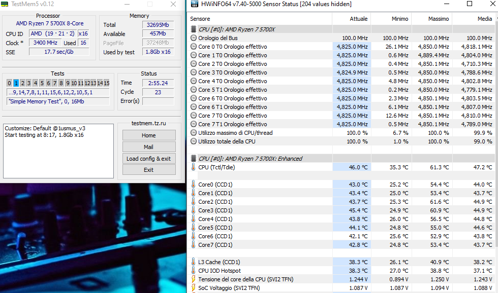 Il CO abbinato al PBO2, serve soprattutto per le prestazioni single thread a bassi/medi carichi di lavoro utilizzando ad esempio le istruzioni SSE (giochi ma non solo) e non le AVX, infatti si testa la stabilità di questo con il programma corecycle che va a testare singolarmente ogni core della cpu per tot minuti in modo da farlo boostare al massimo utilizzando carichi leggeri (istruzioni SSE). Se il programma rilascia errore su quel core testato, devi ridurre il valore negativo del CO a step e così via per tutti gli altri core. Infine, (avendo CO e PBO2 attivi) nel momento in cui vai a stressare la cpu con carichi pesanti MT come AVX, il tutto si annulla e l' algoritmo imposta un vcore stabile per quella determinata frequenza ma sempre in stretta correlazione alla temperatura, la quale più la si mantiene bassa e più la frequenza su tutti i core rimarrà elevata. Ti invito a leggere la guida che ti ho linkato perchè continui a sbagliarti e a fare disinformazione. https://www.hwupgrade.it/forum/showt...5#post45477745 Esempio: questo è l' altro mio sistema, testando la ram con testmem5 che utilizza le SSE come istruzioni, puoi vedere che la cpu boosta a 4850mhz su tutti i core con 1.25v avendo impostato CO e PBO2 e 200mhz di boost clock via bios. Se io dovessi avviare una conversione video con le AVX2, la cpu scenderebbe subito a 4.5ghz con un vcore diverso e rimarrebbe su questa frequenza fino ad un tot di temperatura per poi scendere ancora semmai la temperatura dovesse andare oltre i limiti impostati da AMD, preservando così l'integrità della cpu nel tempo. ![]() Ultima modifica di Mordor42 : 25-11-2023 alle 10:16. |