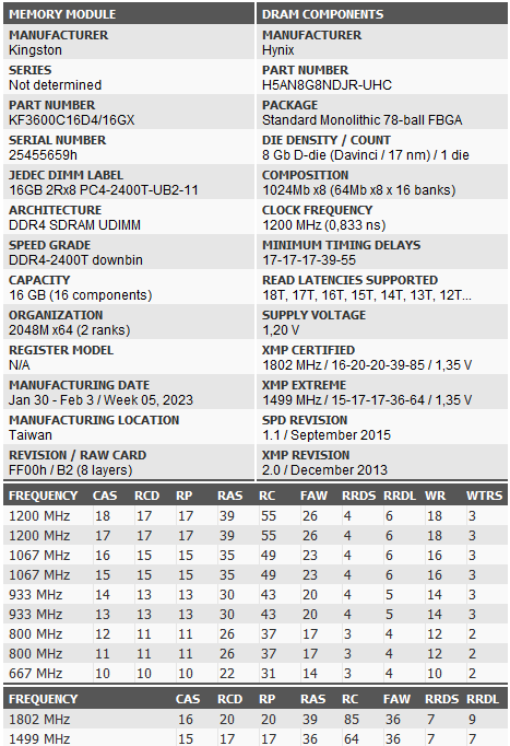 Prepared by Thaiphoon Burner Super Blaster ------------------------------------------------------------- MEMORY MODULE ------------------------------------------------------------- Manufacturer : Patriot Memory Series : Not determined Part Number : 4000 C20 Series Serial Number : 013005A1h JEDEC DIMM Label : 16GB 2Rx8 PC4-2666V-UB1-11 Architecture : DDR4 SDRAM UDIMM Speed Grade : DDR4-2666V Capacity : 16 GB (16 components) Organization : 2048M x64 (2 ranks) Register Manufacturer : N/A Register Model : N/A Manufacturing Date : Jan 29 - Feb 2 / Week 05, 2024 Manufacturing Location : Taipei, Taiwan Revision / Raw Card : 0001h / B1 (8 layers) ------------------------------------------------------------- DRAM COMPONENTS ------------------------------------------------------------- Manufacturer : Hynix Part Number : H5AN8G8N?[F/J]R-VKC Package : Standard Monolithic 78-ball FBGA Die Density / Count : 8 Gb / 1 die Composition : 1024Mb x8 (64Mb x8 x 16 banks) Input Clock Frequency : 1333 MHz (0,750 ns) Minimum Timing Delays : 19-19-19-43-62 Read Latencies Supported : 20T, 19T, 18T, 17T, 16T, 15T, 14T... Supply Voltage : 1,20 V XMP Certified : 2000 MHz / 20-26-26-46-72 / 1,40 V XMP Extreme : 1800 MHz / 20-26-26-46-72 / 1,35 V SPD Revision : 1.1 / September 2015 XMP Revision : 2.0 / December 2013 ------------------------------------------------------------- RAW SPD DUMP ------------------------------------------------------------- 000 23 11 0C 02 85 21 00 08 00 60 00 03 09 03 00 00 010 00 00 06 0D F8 3F 00 00 72 72 72 11 00 72 F0 0A 020 20 08 00 05 00 A8 18 28 28 00 78 00 14 3C 00 00 030 00 00 00 00 00 00 00 00 00 00 00 00 15 2B 16 36 040 0B 2B 0C 36 00 00 36 15 2B 0C 2C 16 2B 0C 00 00 050 00 00 00 00 00 00 00 00 00 00 00 00 00 00 00 00 060 00 00 00 00 00 00 00 00 00 00 00 00 00 00 00 00 070 00 00 00 00 00 00 9C 00 00 00 00 00 E7 00 C6 9B 080 11 11 21 01 00 00 00 00 00 00 00 00 00 00 00 00 090 00 00 00 00 00 00 00 00 00 00 00 00 00 00 00 00 0A0 00 00 00 00 00 00 00 00 00 00 00 00 00 00 00 00 0B0 00 00 00 00 00 00 00 00 00 00 00 00 00 00 00 00 0C0 00 00 00 00 00 00 00 00 00 00 00 00 00 00 00 00 0D0 00 00 00 00 00 00 00 00 00 00 00 00 00 00 00 00 0E0 00 00 00 00 00 00 00 00 00 00 00 00 00 00 00 00 0F0 00 00 00 00 00 00 00 00 00 00 00 00 00 00 74 DF 100 00 00 00 00 00 00 00 00 00 00 00 00 00 00 00 00 110 00 00 00 00 00 00 00 00 00 00 00 00 00 00 00 00 120 00 00 00 00 00 00 00 00 00 00 00 00 00 00 00 00 130 00 00 00 00 00 00 00 00 00 00 00 00 00 00 00 00 140 85 02 02 24 05 01 30 05 A1 34 30 30 30 20 43 32 150 30 20 53 65 72 69 65 73 00 00 00 00 00 01 80 AD 160 00 00 00 00 00 00 00 00 00 00 00 00 00 00 00 00 170 00 00 00 00 00 00 00 00 00 00 00 00 00 00 00 00 180 0C 4A 03 20 00 00 00 00 00 A8 00 00 04 F4 FF 1F 190 00 50 68 68 10 B8 20 F0 0A 20 08 00 05 00 A0 24 1A0 28 00 00 00 00 00 00 00 00 00 00 00 00 00 00 00 1B0 00 00 00 00 00 00 00 00 A3 00 00 05 F4 FF 1F 00 1C0 59 74 74 10 CC 40 F0 0A 20 08 00 05 00 B1 28 2D 1D0 00 00 00 00 00 00 00 00 B5 FB D8 BA BA E7 BA 00 1E0 00 00 00 00 00 00 00 00 00 00 00 00 00 00 00 00 1F0 00 00 00 00 00 00 00 00 00 00 00 00 00 00 00 00