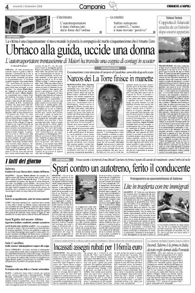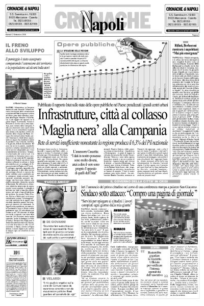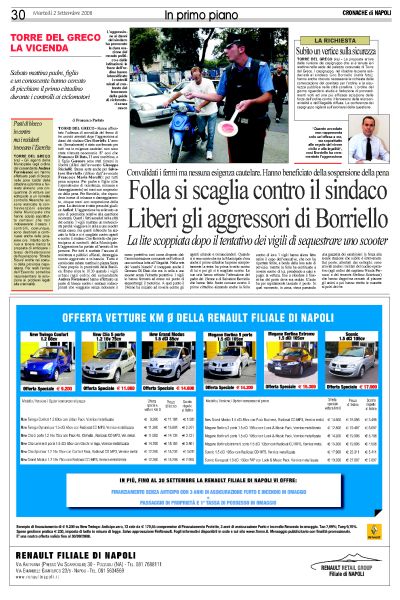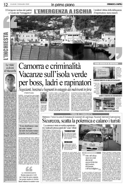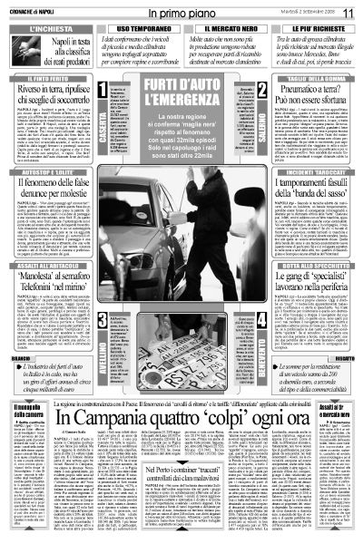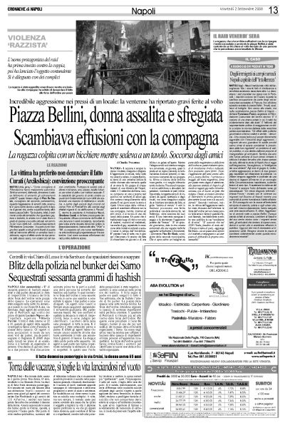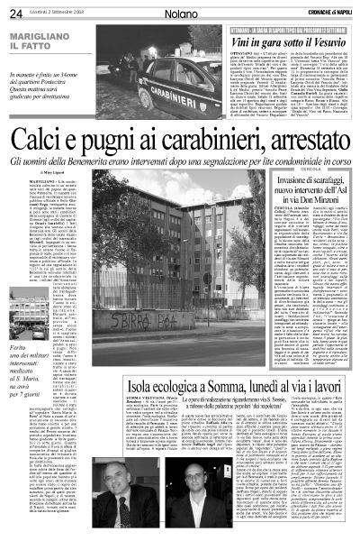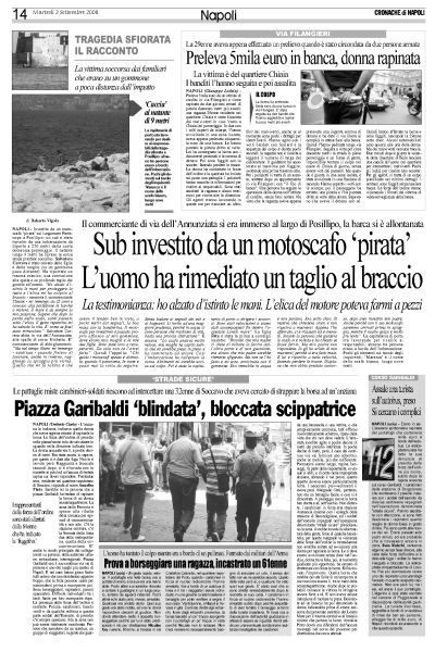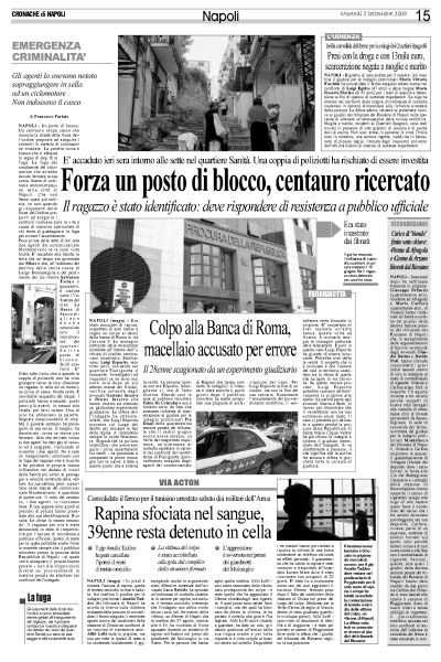 mmm... E questo che a me non piace. Il cercare di far passare Napoli come una città come le altre, con gli stessi problemi di una qualsiasi metropoli. Nè più nè meno pericolosa di una qualsiasi altra grande città. IO ho abitato 6 anni a Roma, e seguivo spesso il tg locale. DI notizie preoccupanti, ce ne erano poche. Mi ricordo molte notizie sul traffico, sulle visite del sindaco in tal o talaltro post, ritardi dei trasporti pubblici e via di seguito. I tg locali di Napoli, sono invece di una città invivibile. Riporto quì le pagine del giornale "Cronache di Napoli"; di oggi 2 Settembre 2008. Per intenderci, non ho preso una giornata particolarmente "nera", ma quello che ho trovato. Quì il sito del giornale http://www.cronachedinapoli.org/edizioni.asp?testata=na ![]() ![]() ![]() ![]() ![]() ![]() ![]() ![]() ![]() ![]() ![]() ![]()