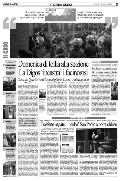Ma provo a fare un'assurdo ! "casualmente" alla prima giornata di campionato viene sorteggiata Roma Napoli , la partita più pericolosa della seire A , ed altrettanto "casualmente" viene consentita la trasferta ai napoletani mettendoli nelle condizioni migliori per fare il cazzo che vogliono : buttarli in un treno non speciale . A me sembra che la cosa sia stata pilotata per bene proprio sapendo che ci sarebbero stati sicuramente imbecilli tra i napoletani ; e poter ora stracciarsi le vesti ed impugnare lo scettro del governo "tolleranza zero" che tanto piace ai complessati ed impauriti elettori italiani. Ovviamente la mia è una provocazione . E non voglio credere che sia stata una cosa tutta organizzata solo per aumentare la repressione ai tifosi , quelli veri , che ormai da anni si vedono trattati come bestie per colpa di " 200 teppisti " e di 20 politici che nulla hanno da invidiare a suddetti teppisti . -sfogo personale di un ex ultras-