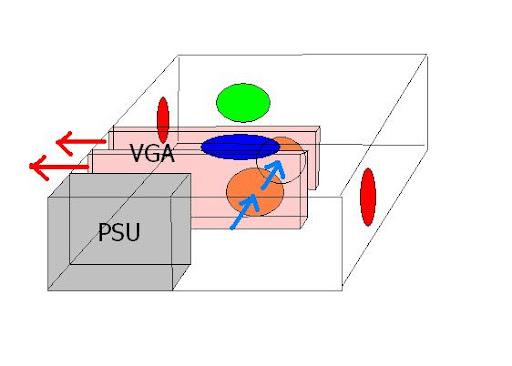 Poi la apertura di sopra se a livello delle 2 vga che vuoi mettere forse è meglio se la introduca l'aria fresca. Ok se possibile assecondare l'aria che va "naturalmente" verso l'alto, ma siamo in regime di raffreddamento forzato per cui possiamo anche fare diversamente. Io userei la stessa ventilazione della posizione classica verticale: anteriore e laterale in immissione (tuo schema rossa n°1 e blu), posteriore e superiore in estrazione (tuo schema rossa n°2 e verde).