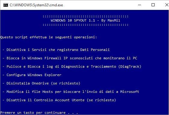Vero è che in rete gira già qualche utility che svolge +o- le medesime operazioni ma, in questo caso, trattandosi di file batch il tutto avviene sotto i nostri occhi pertanto è possibile verificare quello che realmente viene modificato nel nostro PC. Spero di aver fatto cosa gradita. ![]() da qui il download di Windows 10 SPYOUT 1.3: http://www.mediafire.com/download/ej...SPYOUT+1.3.zip Attenzione l'uso di questo file è consigliato solo ad utenti esperti, non mi assumo nessuna responsabilità sull'uso che ne farete! Ultima modifica di maxmil : 29-08-2015 alle 14:14. |
