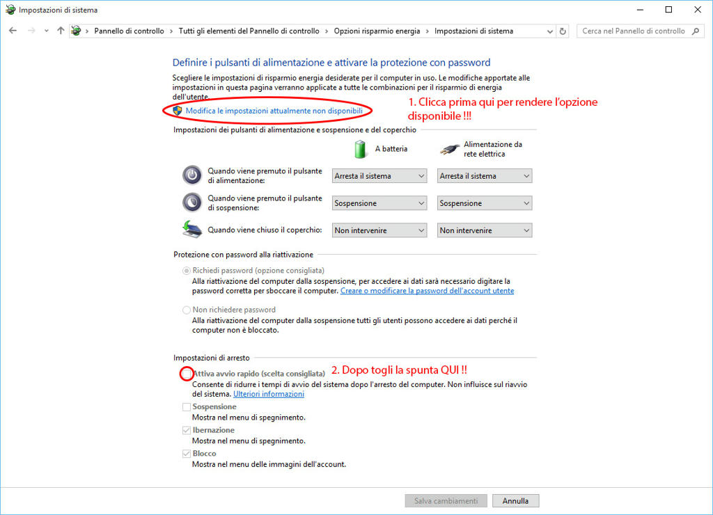 In basso, in "Impostazioni di arresto" controlla se è selezionato l'Avvio Rapido. Se vuoi tenerlo bene (segno di spunta presente), se vuoi rimuoverlo ed è in griglio (non selezionabile) torna in alto nella stessa schermata e clicca su "Modifica le impostazioni atualmente non disponibili". L'ho spiegato qualche post addietro con tanto di immagine esplicativa ...