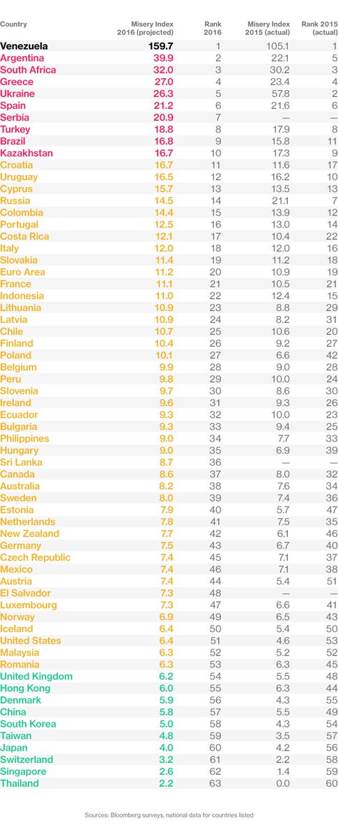 "Inflation does not exist in real life," he wrote in a 2015 pamphlet called "22 Keys to Understanding the Economic War." "When a person goes to a shop and finds that prices have gone up, they are not in the presence of 'inflation.'" Salas has argued against the idea that excessive printing of money causes inflation - an almost universally accepted tenet of macroeconomics. He insists prices rise primarily because corporations seek excessive profit margins. http://www.reuters.com/article/us-ve...0UL27820160107 Sembrano barzellette se non fosse che stanno continuando a stampare moneta mentre il paese è al primo posto come indice di miseria ![]() Quote: