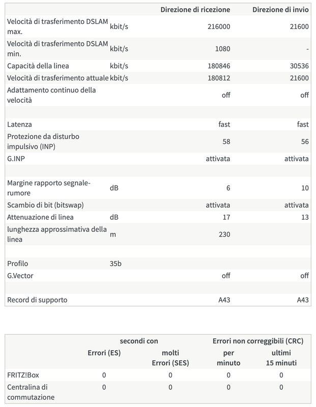 Tengo ancora per qualche giorno questa configurazione per verificare la stabilità di connessione e poi proverò a fare lo switch su Annex B. |
