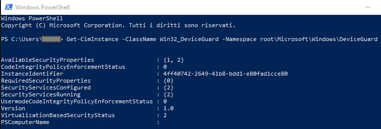 Get-CimInstance –ClassName Win32_DeviceGuard –Namespace root\Microsoft\Windows\DeviceGuard ![]() Al 99% vedrete anche 2 nuovi processi legati a questo discorso, ![]() e, per finire (ma qui proprio ci stiamo allargando), ditemi come è impostata la linguetta chiamata "integrità della memoria" nella scheda "sicurezza dispositivi" che si trova a sua volta in "sicurezza di Windows" ------- Cosa utilizzare per postare immagini (comprese miniature)? https://postimages.org/ Ultima modifica di Averell : 14-11-2018 alle 12:10. |