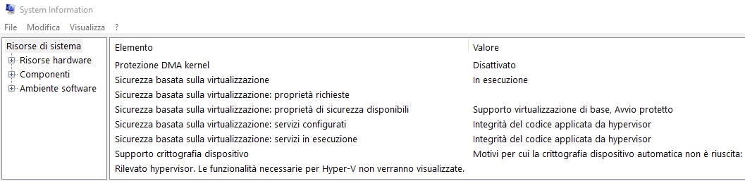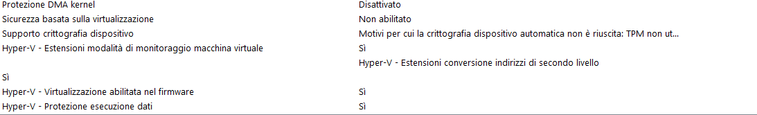 Sicurezza basata sulla virtualizzazione Non abilitato Supporto crittografia dispositivo Motivi per cui la crittografia dispositivo automatica non è riuscita: TPM non utilizzabile, Associazione PCR7 non supportata, Errore interfaccia di test di sicurezza hardware e dispositivo diverso da InstantGo, È stato rilevato un bus/dispositivo con supporto DMA non consentito, TPM non utilizzabile Hyper-V - Estensioni modalità di monitoraggio macchina virtuale Sì Hyper-V - Estensioni conversione indirizzi di secondo livello Sì Hyper-V - Virtualizzazione abilitata nel firmware Sì Hyper-V - Protezione esecuzione dati Sì isolamento core mi dà sicurezza hardware standard non supportata, quindi mettere integrità della memoria non avrebbe effetto Ultima modifica di FulValBot : 14-11-2018 alle 13:33. |