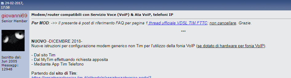 Se vuoi un modem autoconfigurante vedi sito Tim ed attualmente ti proporrà i modem compatibili (al momento). Se acquisti un modem venduto da Tim certamente non rischi di dover pagare l'assistenza tecnica se poi ci sono problemi. ![]()