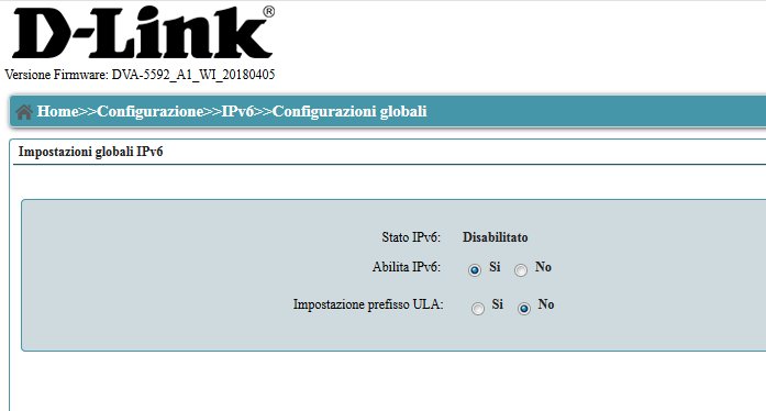 Ciao a tutti, ho cercato nel forum, ma non ho trovato indicazioni di come abilitare IPV6 sul Dlink, per caso qualcuno e' riuscito e se si quali sono gli step?