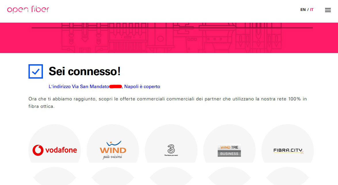 Ciao ragazzi, come previsto, a 3 giorni dall'ultimazione dei lavori e dall'arrivo dei tecnici nel mio condominio, ho avuto questa mattina la bella notizia del sito enel open fiber che la mia abitazione è coperta. (metto immagine sotto)