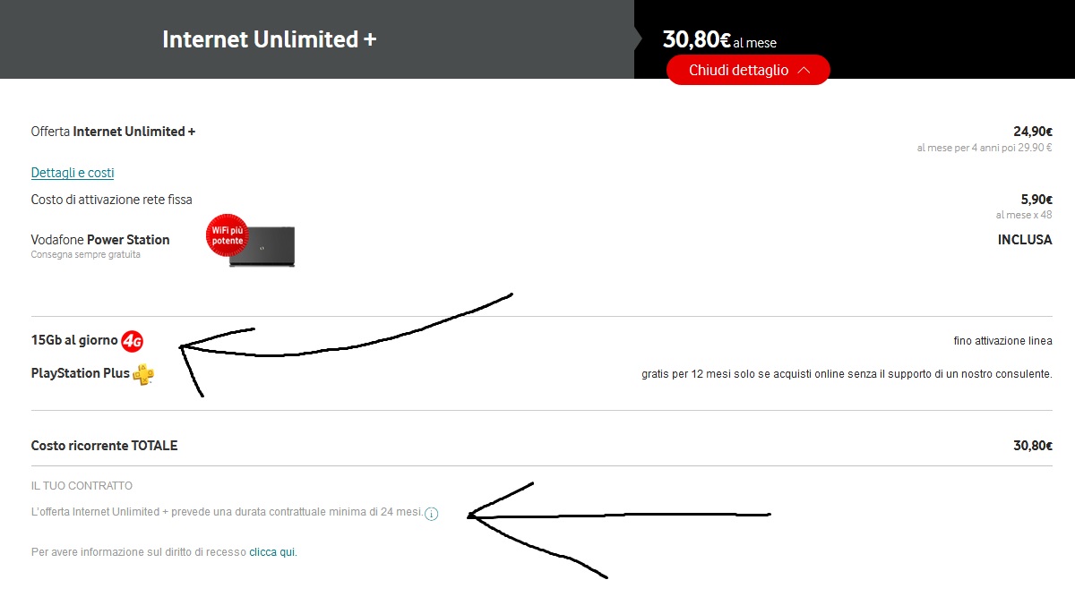 Vodafone a questo punto la preferirei ma: nternet Unlimited + Telefonate immilitate 24,90€ Costo di attivazione rete fissa 5,90€ al mese x 48 mesi 30,80€ al mese quelle 283,20€ di attivazione (5.90€ x 48 mesi) mi rodono non poco. Con Infostrada pagherei 24.90€ al mese e mi darebbero anche una sim da 100 GB al mese... p.s. due dubbi: ma Vodafone con l'offerta regala anche una SIM da 15Gb al giorno ??? c'è un vincolo contrattuale di 24 mesi... ma non era stato vietato per legge ???