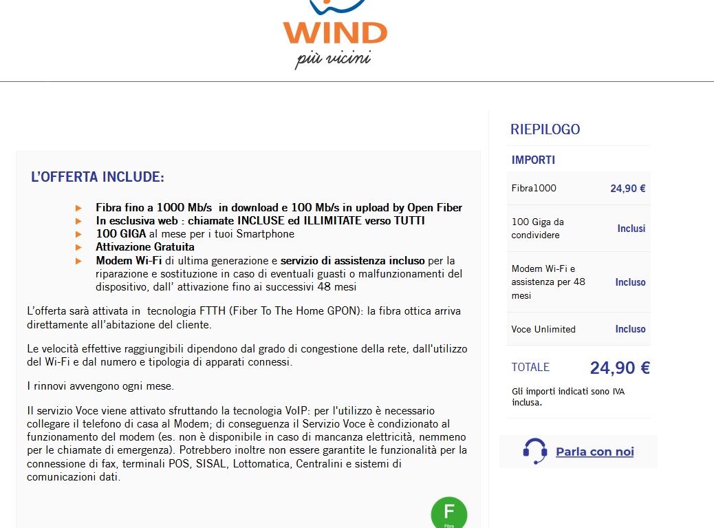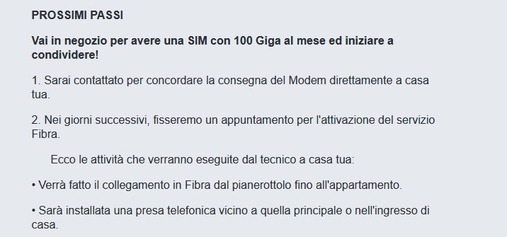 FIBRA FTTH 1000 Infostrada richiesta col prezzo bloccato tutto incluso a 24.90€...la promo è fino al 2 gennaio e non ho voluto correre rischi. Appena me l'attiveranno farò disdetta della FTTC 100 Infostrada, considerando anche che devo aspettare il 17 gennaio per riscattare il Fritz7490 a 1€ Mi è arrivato contratto e tutto il resto via email, viene anche specificato che l'impianto/allaccio in caso si voglia in altri posti in casa, costerà 60€. Non ho particolari necessità della SIM da 100 GB che viene regalata, ciononostante la ritirerò, pensavo che arrivasse col modem ma invece l'immagine che posto sotto dice diversamente, quindi volevo chiedervi info in merito perchè non trovo info nel contratto: - si può andare a ritirare nei negozi quando si vuole ? - che occorre comunicare al negoziante wind ? - il ritiro della SIM con i 100 GB mensili omaggio richiede qualche costo extra ? Grazie
