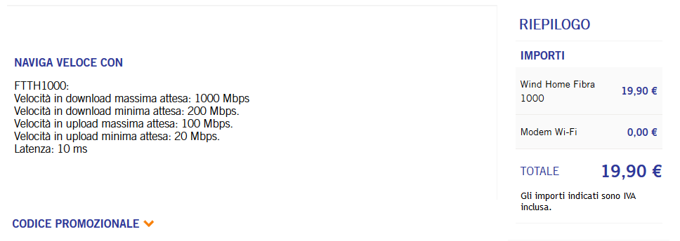 Descrizione dell'offerta Internet 100 L'OFFERTA INCLUDE: Internet illimitato fino a 100 Mb/s in download e 20 Mb/s in upload Chiamate da Fisso a consumo: verso fissi e mobili nazionali e fissi di Europa Occidentale, USA e Canada Attivazione 20,00€ una tantum Modem Wi-Fi di ultima generazione e servizio di assistenza incluso per la riparazione e sostituzione in caso di eventuali guasti o malfunzionamenti del dispositivo, dall' attivazione fino ai successivi 48 mesi Mantieni il tuo numero di telefono E per i clienti Wind con un'offerta All Inclusive anche in versione Easy Pay, Call Your Country Super, Call Your Country Premium e Wind Family una SIM con 100 Giga al mese da condividere. COSTI STANDARD: Abbonamento: 22,90€ al mese. PREZZO BLOCCATO. Chiamate:0,18€ a chiamata (incluse con opzione Unlimited) Attivazione: 20,00€ una tantum Modem Wi-Fi: Incluso I rinnovi avvengono ogni mese |