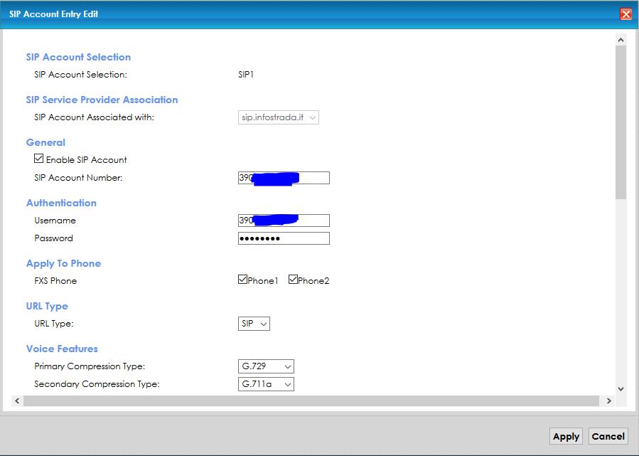 Ho fatto il passaggio da ADSL a Fibra FTTC sempre con Wind, ora la linea dati è funzionante però non vengono riconosciuti i telefoni che collego al router. Seguendo i vai consigli nel forum ho provato senza successo a: - a cambiare MTU - resettare il router sia io che al 155 me lo hanno fatto da remoto un paio di volte ed aspettato un paio di gg come da istruzioni dell'operatore - a cambiare i parametri SIP nella sezione "telefonia" del router - a mettere sia un telefono cordless che fisso, alternando le prese del router Prima di prendere il martello volevo capire nella sezione SIP perchè è tutto disattivato, ho provato ad attivare gli account sia uno che l'altro (vedi immagini allegate)ed anche entrambi ma il led del telefono rimane arancio e dalla cornetta del telefono si sente solo il segnale di occupato. Se li lascio disattivati tutto tace, ma il nome utente e password perchè non ci sono ? Ho provato mettendo "benvenuto" ed "ospite" ma nada. Ma li devono attivare con credenziali "reali" da remoto ?? HEEELP Account SIP http://www.imagebam.com/image/19d9671081048714 http://www.imagebam.com/image/6af9f91081048724 SIP http://www.imagebam.com/image/5a58521081048734 Stato VOIP http://www.imagebam.com/image/1fb5bb1081048754 |