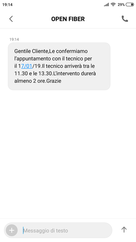 Ho chiesto in famiglia se c'era stato qualche intervento di tecnici nel palazzo e mi è stato detto che per circa 2 ore c'erano dei tizi dell'Enel che hanno lavorato su ogni pianerottolo... mbò se siano loro o meno non si sà... l'unica cosa che notati due giorni fa è che all'esterno del palazzo hanno montano tipo una nicchia con pannello bianco nel muro (non parla dell'armadio che c'è da 1 mese ed è a circa 100 metri dal mio palazzo, ma parlo proprio di una nicchietta nel muro, con pannello bianco, chisua e con su scritto open fiber). |