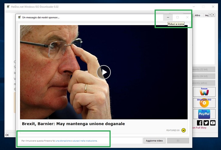 Heidoc.net si corregge La storia di Heidoc.net raccontata nel post n.426 Non c'è più Finalmente....... Adesso sembra tornato tutto a posto, quindi non ci sono più le str....za.....e dei bitcoin bla bla bla...... Ma....quando avviate con doppio click, il tool scaricato di Windows-ISO-Downloader, esce una cosa ugualmente insolita, che è questa > Come potete vede la prima finestra, che appare e che si mette sopra la finestra da cui si scegli il SO da scaricare, non la potete chiudere con la X solita........ma solo mettere a > Riduci a Icona, vabbè......... Se chiudete tutto da task manager, si chiudono tutte e due le finestre . La finestra sotto la finestra pubblicitaria, è sempre la stessa