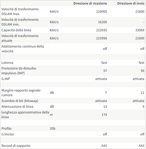 Ho notato che l'ottenibile in upload si è abbassato di 7 mb rispetto all'intervento del tecnico 3 settimane fa, l'unico valore ad essere cambiato è l'SNR che si è quasi dimezzato. I valori, 3 settimane fa, erano questi: ![]() Il tecnico mi ha sistemato l'impianto di casa e fatto il ribaltamento. Ora sono così: Quote: