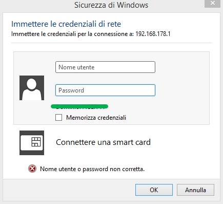 Ho da poco acquistato un 7590...ed ho collegato a questo una chiavetta per poterne condividere i contenuti.. Volendo creare un collegamento a questa sul desktop del mio pc (in rete) ho dunque digitato in "esegui" del Pc la stringa \\192.168.178.1 (che è l'Ip del Fritz!box)...ma Windows mi apre una finestra in cui mi chiede di inserire nome e password..(devi immagine sotto) Io ho provato ad inserire come nome ftpuser (che è quello nativo del 7590) e come password quella del router stesso da me modificata. Purtroppo Windows continua a restituire un messaggio di errore "Nome utente o password non corretta" Devo dire che ci stò ammattendo...poichè in passato con altri router non mi veniva mai chiesto alcun nome...ne password.. Qualcuno saprebbe dirmi cosa sbaglio...e come posso risolvere il problema ? In poche parole vorrei creare una cartella sul mio pc per potervi inserire o cancellare i file da condividere nella mia rete domestica.. Grazie a tutti.. [IMG] [/IMG]