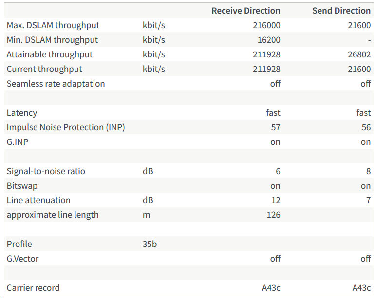 mi hanno detto per telefono che a loro risulta 57 di portante a me 52 bah e che cmq da 57 a 65 non avrebbe senso.... VDSL Training Status: Showtime Mode: VDSL2 Annex B VDSL Profile: Profile 17a Traffic Type: PTM Mode Link Uptime: 0 day: 20 hours: 7 minutes ============================================================================ VDSL Port Details Upstream Downstream Line Rate: 18.318 Mbps 52.299 Mbps Actual Net Data Rate: 18.319 Mbps 52.300 Mbps Trellis Coding: ON ON SNR Margin: 5.9 dB 6.2 dB Actual Delay: 0 ms 0 ms Transmit Power: - 9.6 dBm 14.1 dBm Receive Power: -24.1 dBm 3.9 dBm Actual INP: 53.0 symbols 58.0 symbols Total Attenuation: 14.0 dB 10.1 dB Attainable Net Data Rate: 18.304 Mbps 53.704 Mbps ============================================================================ VDSL Band Status U0 U1 U2 U3 D1 D2 D3 Line Attenuation(dB): 3.2 20.2 32.5 37.9 10.2 26.8 46.2 Signal Attenuation(dB): 3.2 19.3 30.8 37.4 8.2 26.6 46.2 SNR Margin(dB): 5.9 5.9 5.9 5.9 6.2 6.2 6.1 Transmit Power(dBm):-21.7 -12.8 -14.0 -20.3 12.1 7.6 5.8 ============================================================================ VDSL Counters Downstream Upstream Since Link time = 7 min 13 sec FEC: 3039 844 CRC: 0 0 ES: 0 0 SES: 0 0 UAS: 0 0 LOS: 0 0 LOF: 0 0 LOM: 0 0 Retr: 0 HostInitRetr: 0 FailedRetr: 0 Latest 15 minutes time = 7 min 48 sec FEC: 26 3 CRC: 0 0 ES: 0 0 SES: 0 0 UAS: 0 0 LOS: 0 0 LOF: 0 0 LOM: 0 0 Retr: 0 HostInitRetr: 0 FailedRetr: 0 Previous 15 minutes time = 15 min 0 sec FEC: 12 5 CRC: 0 0 ES: 0 0 SES: 0 0 UAS: 0 0 LOS: 0 0 LOF: 0 0 LOM: 0 0 Retr: N/A HostInitRetr: N/A FailedRetr: N/A Latest 1 day time = 20 hours 7 min 48 sec FEC: 3039 844 CRC: 0 0 ES: 0 0 SES: 0 0 UAS: 35 35 LOS: 0 0 LOF: 0 0 LOM: 0 0 Retr: 0 HostInitRetr: 0 FailedRetr: 0 Previous 1 day time = 0 sec FEC: 0 0 CRC: 0 0 ES: 0 0 SES: 0 0 UAS: 0 0 LOS: 0 0 |
