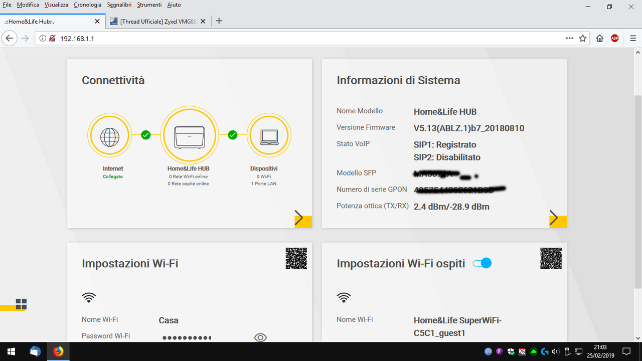 Si riavvia il modem e voilà... update fatto !!! Questa è la nuova interfaccia che mi sono ritrovato IMG: https://i.postimg.cc/Wz4kWbXs/Update.png Ho alcune domande in merito: 1- possibile che l'update del firmware sia legato alla telefonata all'assistenza clienti ??? 2- nelle nuove info del firmware noto che appare una voce che si chiama POTENZA OTTICA e la si può vedere dall'immagine che ho linkato sopra... che significa e come si legge questo parametro della "potenza ottica" ??? quelli che ho io sono buoni ? 3- quali sono concretamente le novità di questo nuovo firmwware rispetto a quello precedente ? Grazie |