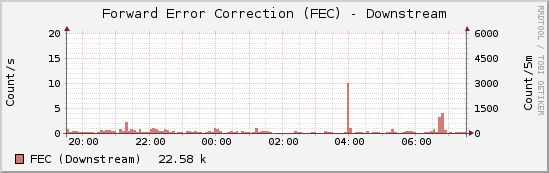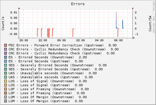 $ xdslctl info --stats ... Latest 1 day time = 12 hours 2 min 52 sec FEC: 22664 8 CRC: 3 0 ES: 2 0 SES: 0 0 UAS: 0 0 LOS: 0 0 LOF: 0 0 LOM: 0 0 Retr: 0 HostInitRetr: 0 FailedRetr: 0 ... ):![]() Il resto degli errori (ho girato il segno dei dati in up per non affollare il grafico, quindi gli 8 FEC up hanno segno negativo, ma il totale risulta sempre positivo): ![]() PS: in teoria questi dati si possono recuperare anche con firmware originale, visto che l'accesso telnet/ssh è sempre stato attivo; ovviamente non li elaboro sul modem stesso, ma su un raspberry pi |