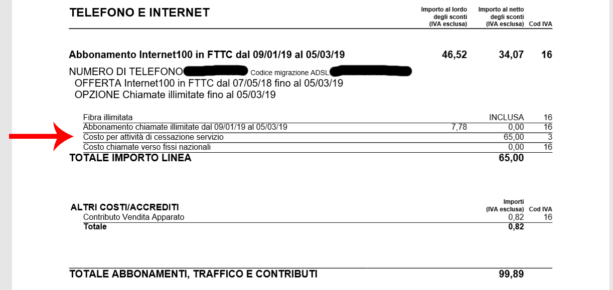 Ciao ragazzi, per chi come me ha disdetto la FTTC di Infostrada per passare alla FTTH sempre di Infostrada e per chi lo ha fatto approfittando della libera Agcom 487/18/CONS che prevedeva il costo di cessazione non potesse superare il costo mensile di un canone... ecco la porcata arrivata oggi e naturalmente contattato chi di dovere mi è stato detto che per quando mi possano addebitare 30 giorni extra post disdetta, la cessazione di 65 € è non conforme alla delibera. RID Conto bloccato per l'utenza FTTC di Infostrada che fortunatamente ho visto essere diverso dal RID sulla quale verrà pagata la FTTH (sempre di Infostrada) Che schifosi... posto immagine bolletta appena arrivata.