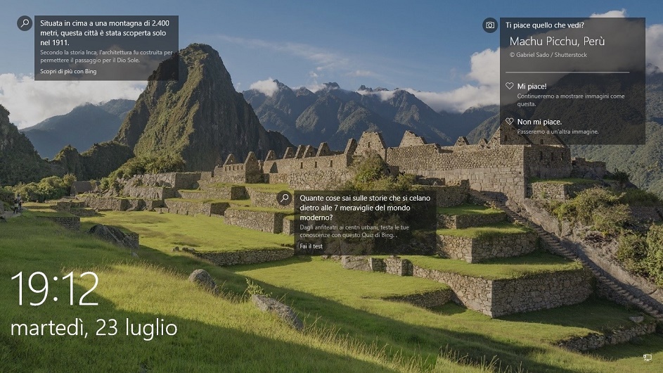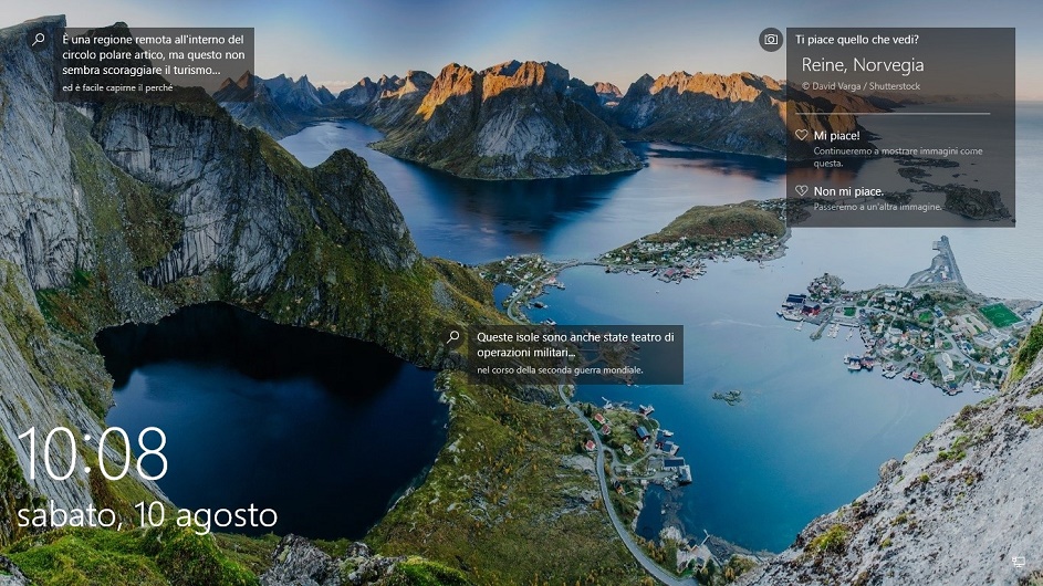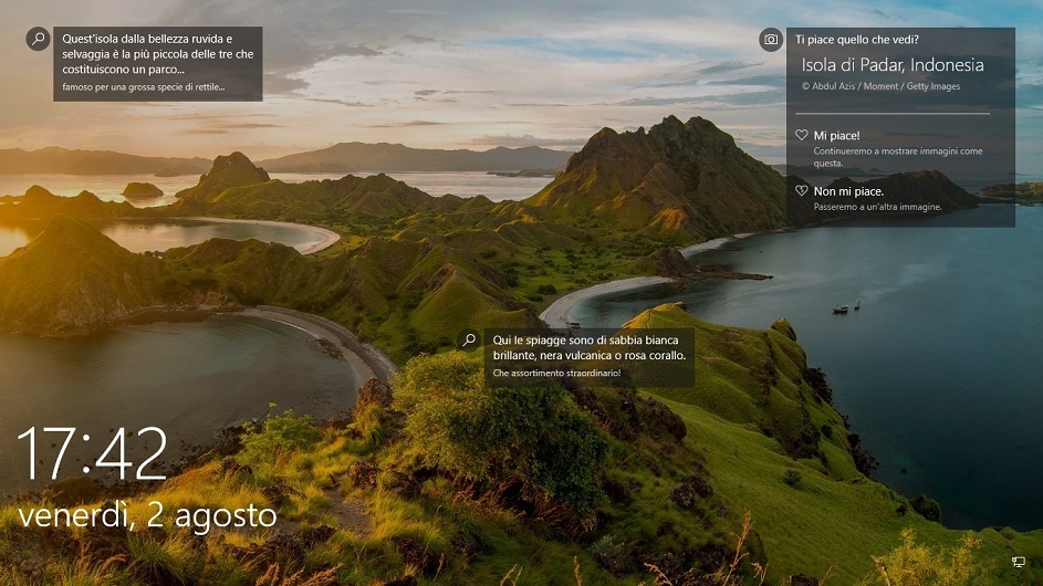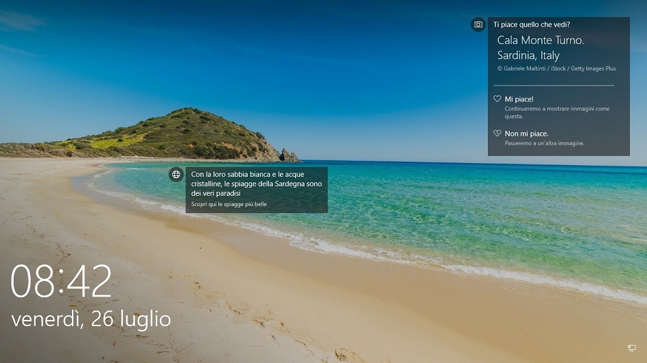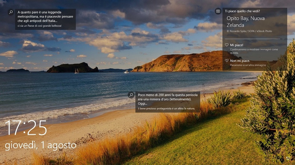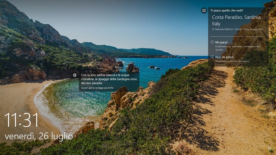 Windows 10 SpotLight Images On Screen Italy Ancora una volta, l' Italia è la Protagonista delle immagini di Windows 10 SpotLight Images, questa volta On Screen . Questa immagini che è non estiva, è Super Estiva Quindi a maggior ragione, la posto qui, anche perchè ha un effetto veramente rilassante, positivo, estivissimo, a dir poco splendido Da notare nell' immagine On Screen che ci sono solo 2 Descrizioni, invece di tre, che solitamente appaiono . Ma va bene ugualmente Come si dice ? C' era una canzone che faceva......The summer is magic......... Edit > da un Paradiso a un altro Appena apparsa On Screen un' altra immagine meravigliosa, sempre della nostra amata Italia e sempre con 2 solo Descrizioni, il Titolo in alto a destra e la Descrizione centrale, mancherebbe la Descrizione in alto a sinistra D' altronde in Italia ci sono moltissime belle spiagge, da tenere sempre pulite E qui, andiamo veramente in Paradiso, visto il nome del luogo Anche questa immagine, non è ancora stata pubblicata in Windows 10 SpotLight Images > Italy