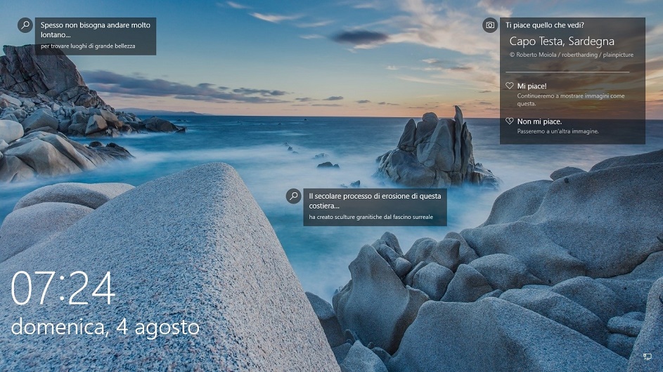 Windows 10 SpotLight Images On Screen Italy Due bellissime immagini dell' Italia, anche se sono apparse un pò di giorni fa....... Andiamo in Sardegna e in.......Sicilia, nella Riserva naturale dello Zingaro . Soprattutto la seconda immagine, è molto Estiva Ambedue le immagini, sono state già pubblicate da o in Windows 10 SpotLight Images, come si evince dal Titolo in Inglese, che c'è subito dopo il Titolo in Italiano Le Descrizioni, nelle Immagini On Screen, sono molto Importanti, in quanto fanno capire di più