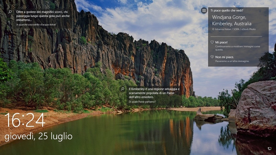 Windows 10 SpotLight Images On Screen Molto carne al fuoco, oggi Iniziamo con un' immagine On Screen, niente male, che non è stata ancora pubblicata in Windows 10 SpotLight Images e questo giro siamo in Australia Cos' è Windjana Gorge ? Gorge in inglese vuol dire gola . Windjana Gorge National Park è un parco nazionale nella regione di Kimberley nell'Australia occidentale, 1855 km a nord-est di Perth e 355 km a est di Broome. Aperto solo durante la stagione secca - di solito da aprile a novembre (le date variano in base alle condizioni). La gola è stata scolpita dal fiume Lennard ed è lunga oltre 3 km e larga circa 100 m con pareti fino ad un'altezza di 30 m in alcuni punti. Le rocce fanno parte della Napier Range, un antico sistema di barriera corallina della Devonia che ha oltre 375 milioni di anni. Le rocce sono uguali a quelle trovate a Tunnel Creek e Geikie Gorge. Il fiume scorre liberamente attraverso la gola durante la stagione delle piogge ma durante la stagione secca (tra maggio e settembre) diventa una serie di piscine circondate da alberi e arbusti. Parte della vegetazione trovata lungo le rive del fiume comprende corteccia di carta, cadi di legno, fichi nativi e alberi di leichhardt.