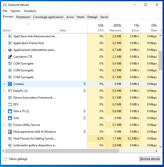 Io invece ieri ho perso mezzo pomeriggio formattando e reinstallando tutto, pensando che fosse legato ad altro, per poi notare solo oggi che il problema era Cortana che mi occupava costantemente la CPU al 10%.