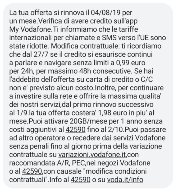 contratto fatto a novembre 2018 "Vodafone special minuti 50 giga" minuti illimitati -no sms inclusi- 6,99€ (+ 1,98€ dal 1 settembre sarà 8,97€) quindi dopo 9 mesi dal contratto