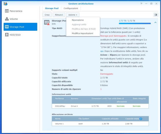 una volta sostituito basta andare qui: ![]() e premere su "RIPARAZIONE"? sul tubo trovo video in inglese cui stato di raid è "degraded" mentre nel dsm italiano c'è scritto proprio "danneggiato" è la stessa cosa? ovviamente nell'immagine sopra non si vede il disco danneggiato come all'inizio perchè ho fatto un reboot del nas quindi suppongo pensi che l'ho già sostituito adesso vado a cercare come si riconosce fisicamente il disco 1 dal disco 2 |