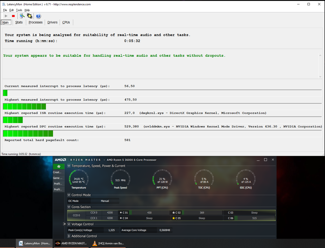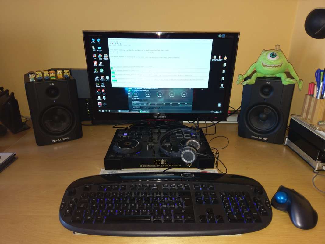Buone anche le latenze audio del SO con la piattaforma Ryzen, anche se migliorabili a causa dei driver NVIDIA..ed infatti ho in arrivo una Radeon RX550 in sostituzione della GT1030 che assicura picchi di latenza inferiori ed in più ha l' encoder hardware HEVC H265 rispetto alla GT1030 che ha solo il decoder, una manna dal cielo se si fanno conversioni video con il codec H265, sgravando peso alla cpu spostando così il carico sulla GPU con ottimizzazione soprattutto dei tempi di conversione. Come scheda audio uso la Console Hercules RMX2 con driver audio ASIO settati con il buffer a 4ms