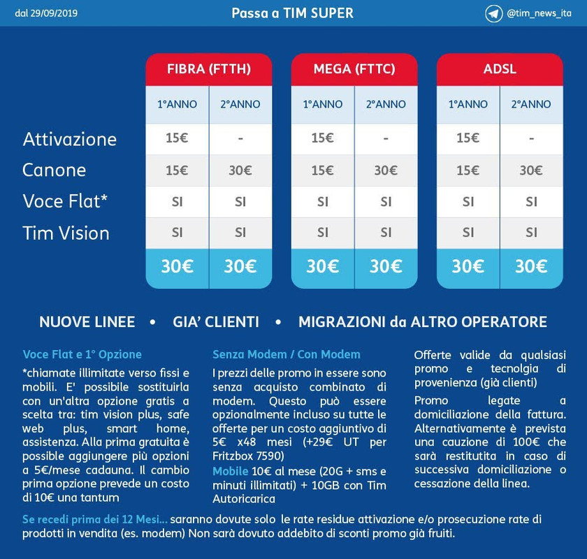 ![]() Inoltre, da sito UFFICIALE TIM: ![]() ![]() Con le Tim Super paghi dunque 30 Euro/mese sia da nuovo che da già cliente Tim, senza modem Tim a rate, con prima opzione inclusa gratis per sempre (ad esempio l'opzione voce per le chiamate gratis), vincolo 12 mesi. In più da già cliente Tim, se hai rate in essere ad esempio Tim Expert, Modem ecc. esse si trascinano normalmente e mensilmente sulla nuova Tim Super, quindi 30 Euro/mese + rata/mese trascinata del prodotto che già si sta pagando. Se non si hanno rateizzazioni attive, si pagheranno solo i 30 Euro/mese della Tim Super. Stop. Ultima modifica di Bigbey : 09-10-2019 alle 21:14. |