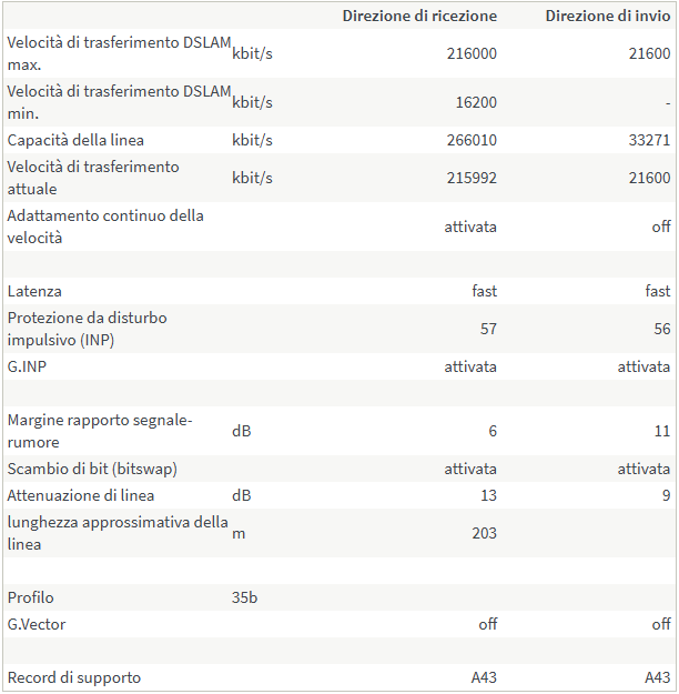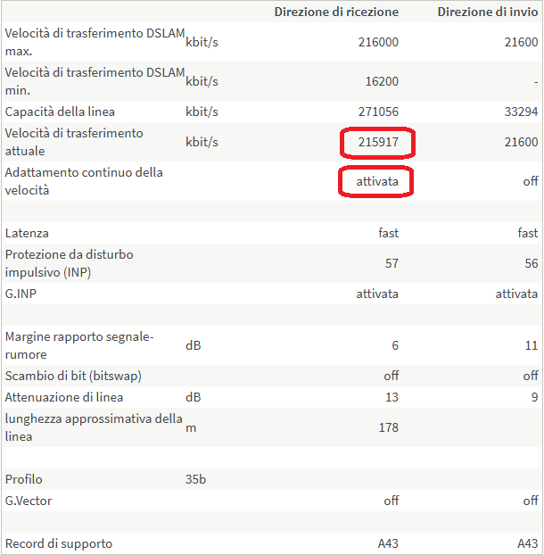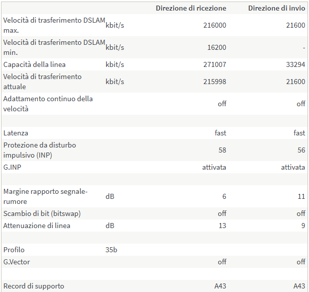 la situazione attuale mia adesso è: Direzione di ricezione Direzione di invio Velocità di trasferimento DSLAM max. kbit/s 108000 21600 Velocità di trasferimento DSLAM min. kbit/s 1080 - Capacità della linea kbit/s 66856 23922 Velocità di trasferimento attuale kbit/s 66856 21599 Adattamento continuo della velocità off off Latenza fast fast Protezione da disturbo impulsivo (INP) 90 102.3 G.INP attivata attivata Margine rapporto segnale-rumore dB 5 7 Scambio di bit (bitswap) attivata attivata Attenuazione di linea dB 11 17 lunghezza approssimativa della linea m 272 Profilo 17a G.Vector off off Record di supporto A43 A43 Contatore degli errori secondi con Errori non correggibili (CRC) Errori (ES) molti Errori (SES) per minuto ultimi 15 minuti FRITZ!Box 0 0 0 0 Centralina di commutazione 0 0 0 Considerando che ho il profilo 12db e il filtro Belkin che si mangia circa 4 mega non mi posso lamentare... certo prima andavo a 75 max ma a volte dopo 15 gg scendeva a 70 perche SRA decideva di passare da 3 a 4-5 db e dovevo rinegoziare la portante per tornare a 75 per altri 15 gg. E per qualche mega magari evito proprio di discutere col 155. NB.Il problema principale della mia linea resta la diafonia poiche ho ben 4 disturbanti nel palazzo.. penso che l'altro pomeriggio manco la corrente e a molti nel palazzo era proprio scattato il salvavita.. bhe in quei minuti andavo a 78 e il mio vicino max ottenibile 104! e chi li ha visti mai... poi appena hanno acceso è riscesa a 66 intervendo SRA perche era arrivato a 1db dai 5 iniziali... Ultima modifica di jhonny82 : 18-11-2019 alle 20:52. |