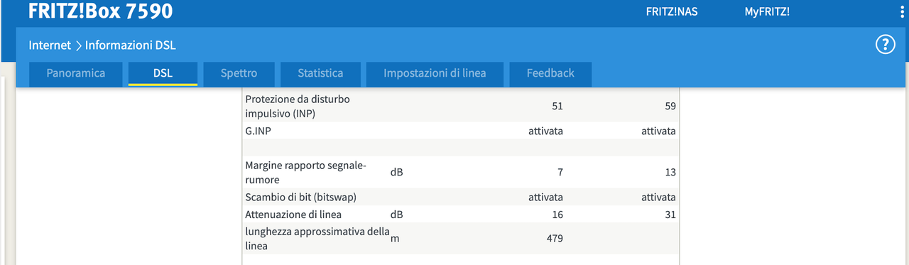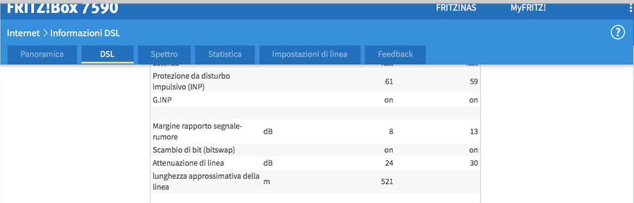 Per riepilogare ho due 7590 online: sul primo la 7.13 con DSL versione precedente che per questo equivale alla 1.180.129.3, DSL attiva da: 14 giorni, 23 ore, 2 minuti errori vedi.. DS Attainable: 77782 DS Delay: 0 DS INP: 51.0 DS Trellis: 0 DS Bitswap: 1 DS Bitswap Cnt: 8192 DS Margin (dB): 7 DS Margin per Band (0.1dB): 7,7,7,-63,-63 DS Attenuation (dB): 16 DS Attenuation per Band (0.1dB): 12,33,50,127,127 DS Powercutback: 0 DS SRA: 0 DS SRA Cnt: 0 DS ES: 2 DS SES: 0 DS total CRC: 2 DS total FEC: 0 DS CRC per Minute (0.01): 0 DS FEC per Minute (0.01): 0 DS CRC 15 Minutes (0.01): 0 DS FEC 15 Minutes (0.01): 0 Altro 7590 con la INHAUS precedente che ha la nuova versione del driver DSL. la 1.180.131.38 Poi proseguirò quando a casa per abbastanza tempo con i confronti. Per il momento quello che posso indicare come confronto è quanto vedrete di seguito, dedicato a coloro che pensano che le linee siano tutte uguali e che il discrimine sia dovuto all'apparato. Garantisco che la inversione dei due 7590 tra le due linee ha lasciato i risultati pressoché invariati e sovrapponibili . I vari siti di controllo copertura mi danno una distanza dall'armadio di circa 700 metri. Se la linea segue nella parte interrata la sede stradale l'ordine di grandezza è verosimile, se taglia per i prati non so dire. Quindi, le due linee sono attestate sulla stessa centrale, stesso armadio, stesso DSLAM. Identico cavo multicoppia sino alla medesima chiostrina. Da li due identici cavi, entrambi nuovi (il primo posato a giugno 2019, il secondo dicembre 2019) di identica lunghezza che corrono paralleli sino all'ingresso nell'abitazione dove fianco a fianco sono i due 7590. Le differenze evidenti riguardano l'attenuazione che si traduce in una minore distanza stimata dal 7590 una minore presenza di errori e una stabilità nettamente superiore... nella prima linea sono oltre 14 giorni con due (2) errori , nella seconda quasi due giorni con 8 errori. Linea uno ![]() Linea due