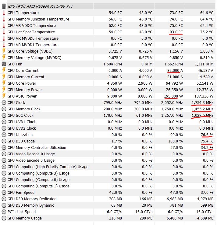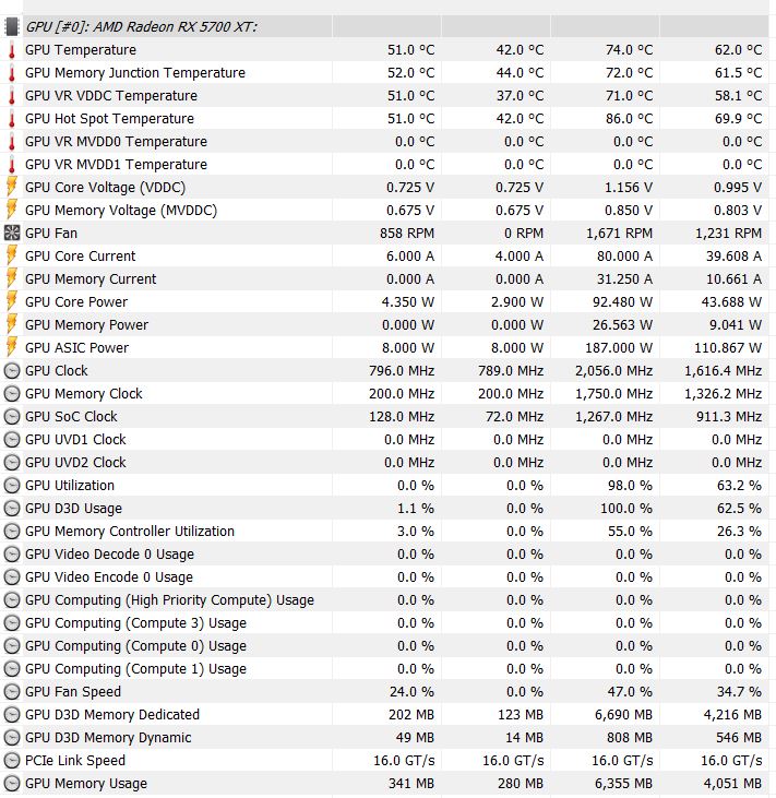 ![]() Questi i risultati in 1080p: ![]() Questi in 2k: ![]() Quindi in 2k (2560x1440) abbiamo: L'hotspot che aumenta di 6 gradi 2 A in più sul GPU Core Current e mantenuto più a lungo vedendo la media 7 W in più sull ASIC Power con una media di 137W rispetto ai 110 del 1080p GPU Clock con la media più alta, probabilmente in 1080 riesce a calare Un Memory clock più elevato in media (1455 mhz rispetto ai 1362 del fullhd) Idem per il Soc Clock con una media di 1028 rispetto ai 911 del fullhd Media più alta per l'utilizzo della gpu (gpu utilization) con un 76% vs 63 Media più alta sul d3d Usage con 75% vs 62 Media più alta sul controller delle memorie ma è ovvio, 26% vs 32 Sommando il tutto è evidente che la si spreme di più in 2k, mentre in 1080 riesce magari a non stare al 100% (98 nel mio caso) tutto il tempo. Sono sempre più contento di aver sventrato sta xfx, ventole maxate al 45%. Fa più rumore la cooler master a levitazione magnetica che la scheda video lol |