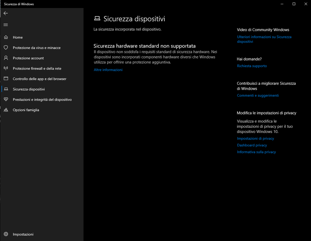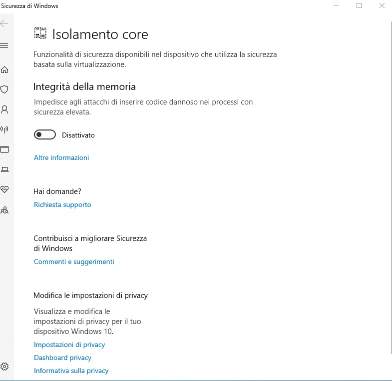 Se si stesse utilizzando un dispositivo con Windows 10 installato, basato su processore a 64 bit e supporto per le tecnologie di virtualizzazione Intel VT-X o AMD-v, il sistema operativo attiva la funzionalità Isolamento core.
