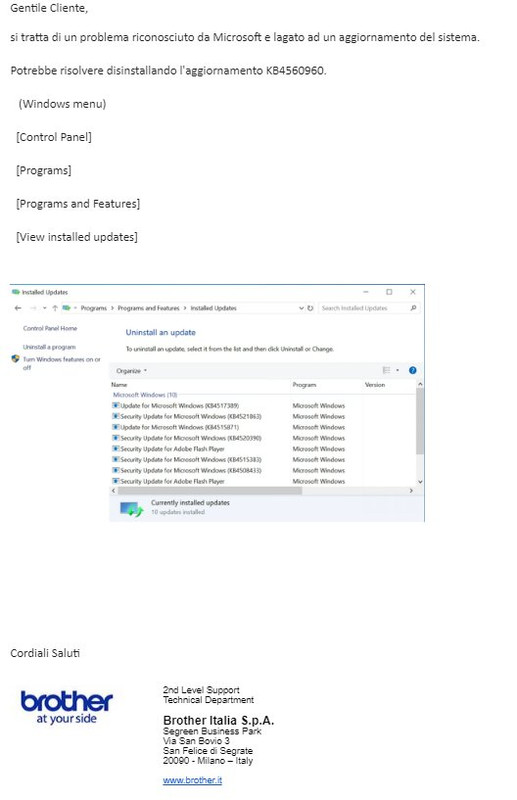 Nei vari tentativi ho fatto anche quello che hai suggerito, ma senza risultato. Sarà che il problema è noto da tempo, ma a me è comparso solo con l'ultima patch. Rimossa questa la stampante si è rimessa a funzionare regolarmente senza rimettere mano a nessuna procedura. Ergo, è la patch il problema. Almeno, per il mio caso è questa patch la causa del problema. Questa, tra l'altro, la risposta di Brother:
