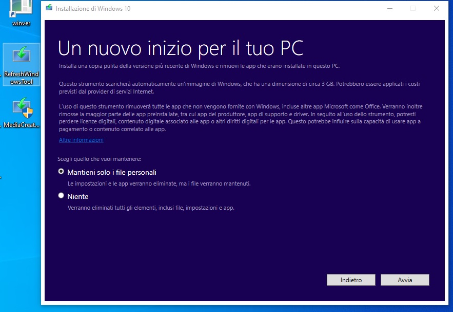 Sono andato qui https://www.microsoft.com/it-it/soft...ws10startfresh Ho scaricato questo programmino e poi ha fatto sul serio tutto lui, nel senso che avviato questo programma nel wizard io ho solo selezionato che volevo rimuovere tutto.