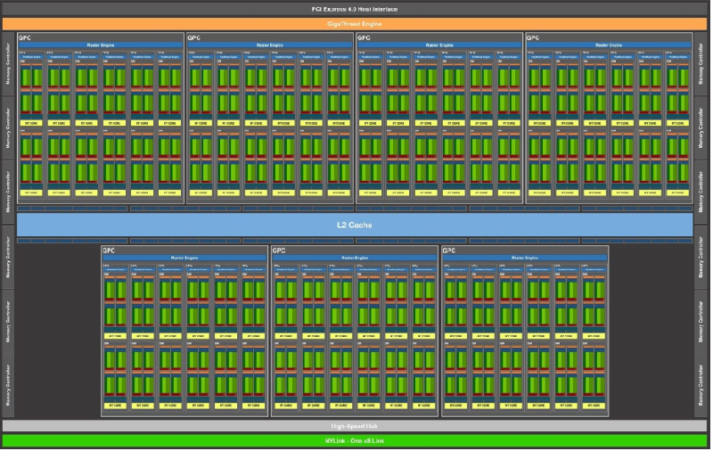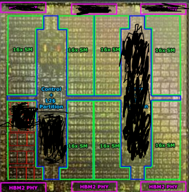Basta soffermarsi sui rapporti, e ne basta uno. I tensor sono 4 x SM (SM 64 cc). Per 672 tensor dovresti avere 10752 cuda in 168 SM. 168 SM x 4 = 10752cc. Anche i cc sono da tesla, ti propongo una versione a cazzum, moddata da me in 2 secondi. ![]() Come puoi vedere ho dovuto buttare giù quasi tutta la cache e le rop's per il collegamento. Abbattendo per forza 3 stack, ma facendo così scendi a 24 gb. Un altro fattore riguarda gli RT core, questi nel chip tesla non ci stanno, così come non ci sono i polymorph engine, necessari. Lo stesso gli RT core, che sono 168, questo significa avere 168sm e 10752cc, come la tara fatta con i tensor. Diciamo che non torna un parametro.