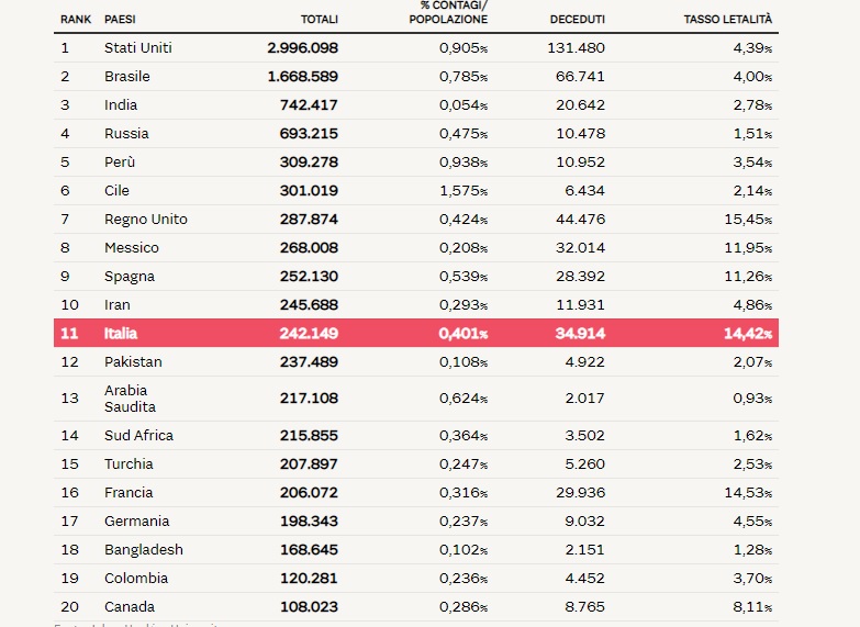 Per dire, Brasile e USA hanno tassi di letalità molto bassi anche e soprattutto per quel motivo. Il problema è che sono scelte volute e consapevoli anche per lanciare messaggi precisi. Peccato che poi non avrai mai un'idea chiara e precisa della situazione reale.