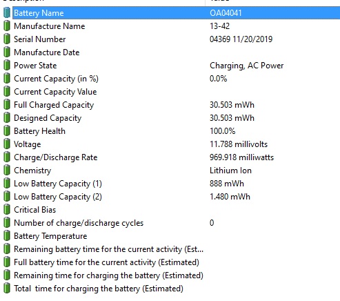 E' completamente scarica, Current capacity è 0%, però è come nuova poiché il parametro Health riporta 100% e Designed capacity coincide con Full charged capacity.
