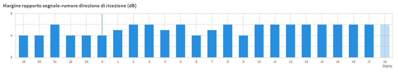 ![]() A distanza di 6 ore ancora 0 ES/SES/CRC , solo SNRm tende ad essere più variabile rispetto a qualche tempo fa (oscilla tra un max di 8 e un min. di 4 dB, ma per lo più lo vedo ai canonici 6 dB). In ogni caso per ora tutto bene, la connessione è tornata stabile. P.S. Suggerisco al "tecnico" che ha fatto l'ultima attivazione di dedicarsi al giardinaggio, in modo da limitare i danni