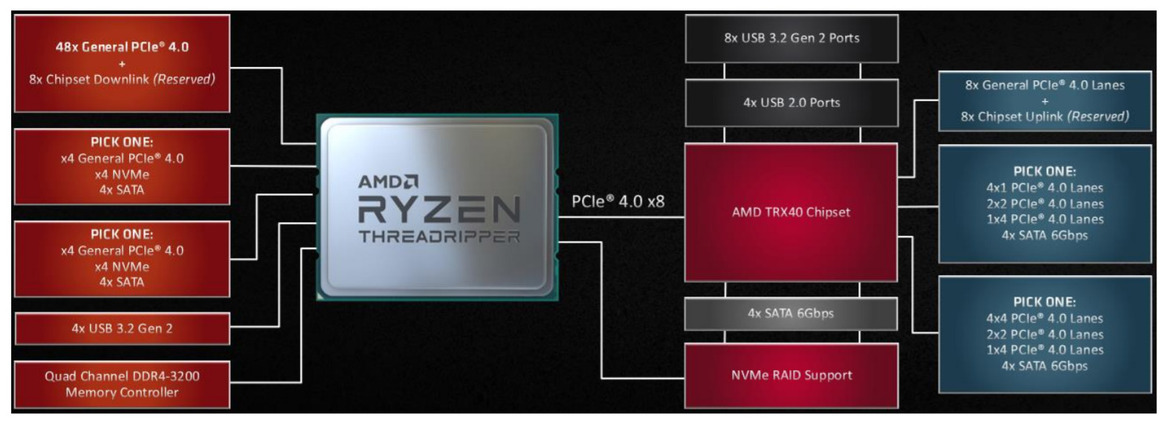 Il discorso è che le linee che vengono dalla CPU serie 3000 sono tutte 4.0. Oltre a quelle citate, ci sono anche 4 linee PCU Express 4.0 che vanno al chipset. Ora, tutte le periferiche che sono "attaccate" al chipset in realtà condividono queste 4 linee PCI Express che vanno alla CPU, per cui se collego troppe periferiche poi saturo la banda di questa connessione (normalmente non c'è un accesso contemporaneo per cui nell'uso comune non si hanno particolari problemi). Con il Threadripper questo problema è estremamente ridotto perché le linee PCI express che vanno al chipset sono parecchie di più (vedi immagine sotto) così come di più sono le linee USB/NVME connesse direttamente alla CPU...