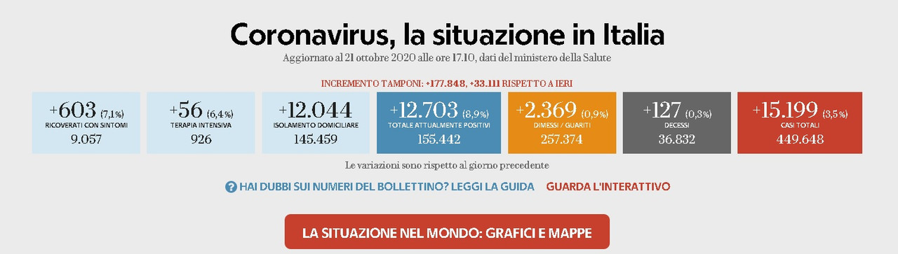 15.199 nuovi positivi su 106.488 casi testati (oltre 177.000 tamponi totali), il 14%; 56 TI (926) e 603 ricoveri (9057) in più, 127 decessi.....