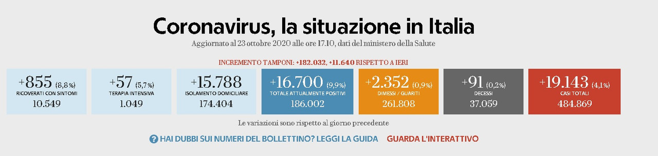 19143 nuovi positivi su 114499 casi testati (182032 tamponi totali), il 16,7%, 1 su 6; 57 TI e 855 ricoveri in più, 91 decessi